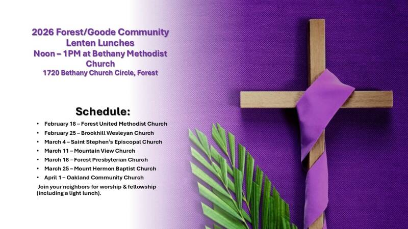 | Feb.18 | Ash. Wed. Lenten Lunches begin | Bethany Methodist Church |