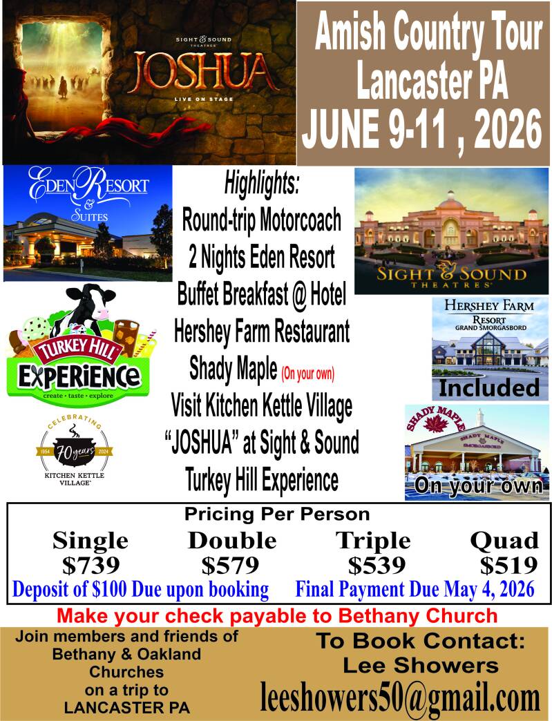 | Jun. 9-11 | Joshua Trip to Sight and Sound | Bethany Methodist Church |